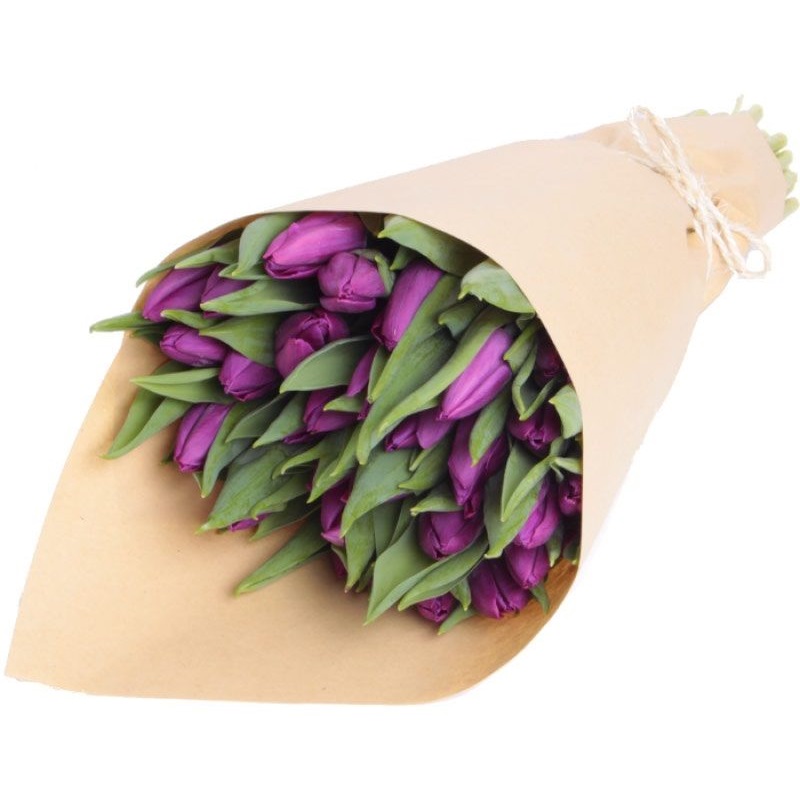 Букет состоит из 25 сиреневых тюльпанов, крафт.