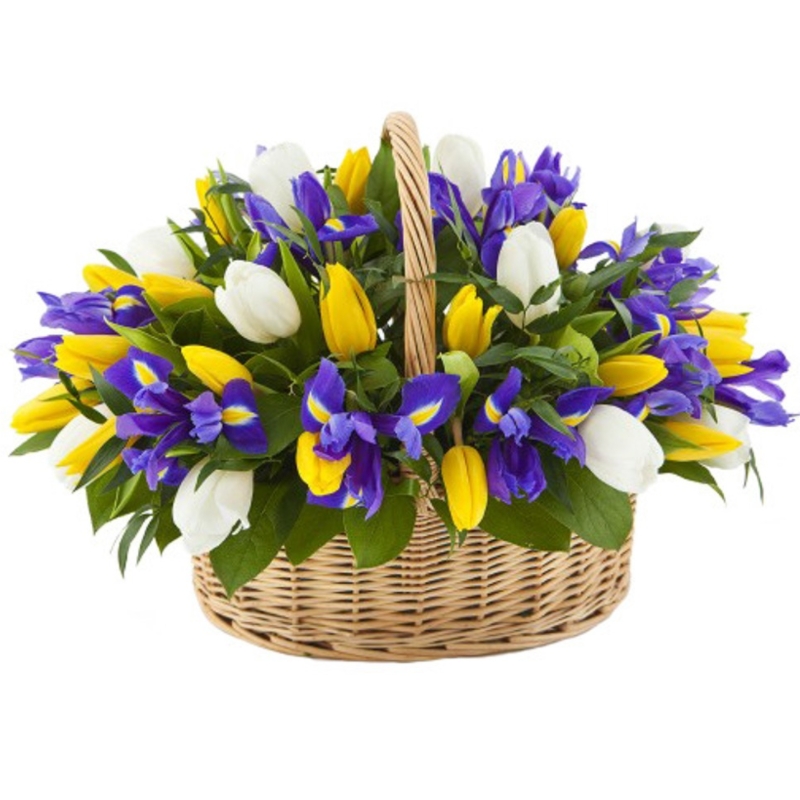 30 желтых и белых тюльпанов, 19 ирисов, рускус, корзина, оазис.
