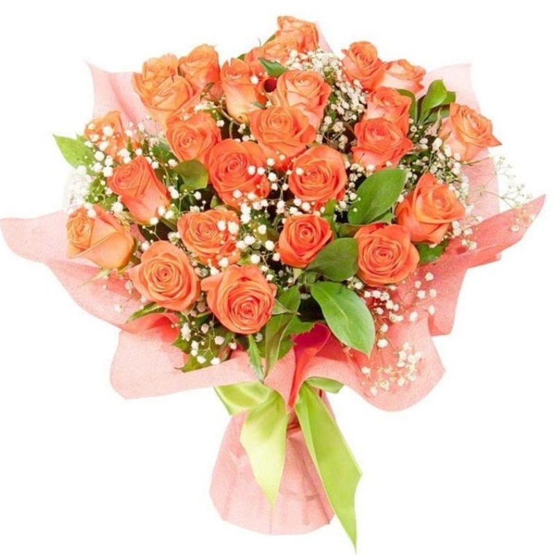 Букет состоит из 31 оранжевая роза, 5 гипсофила, зелень, красивая упаковка, атласная лента.